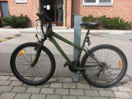 | Inde i gården hvor jeg bor i cykelstativet. Cyklen var fastlåst til en anden låst cykel, med en Abus Catena 685 kædelås. Den anden cykel står der stadig. |