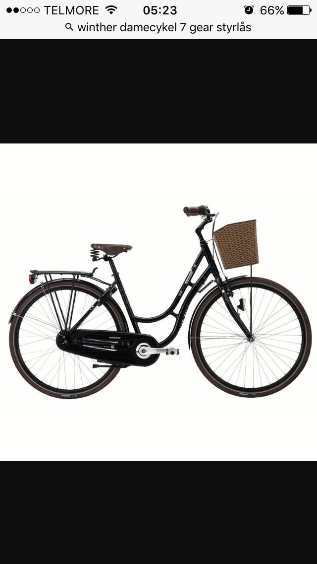 Sort damecykel (bedstemorcykel) fra Winther. 7 gear, dobbelt støttefod i "knallert-stil", Brooks sadel i brunt læder med fjedre bagpå, flettet brun kurv foran(den er gået lidt i stykker), brune håndtag, magnetlygter både foran og bagpå, punkterfrie dæk. Forbremsen er taget af på den ene side, så den virker ikke. Den har styrlås foran.