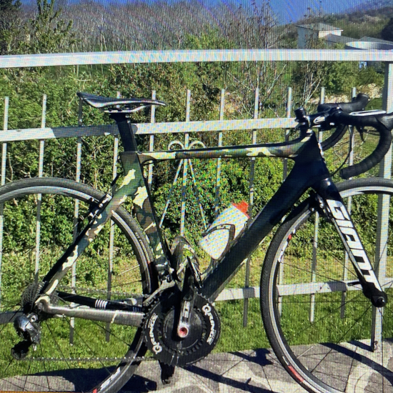 Det er en Giant Propel Advanced 0 med Shimano Ultegra Di2, som oprindeligt ser ud som vist på billedet. Dog har min cykel fået lavet camouflagefarvet folie, som I kan se på det andet billede.